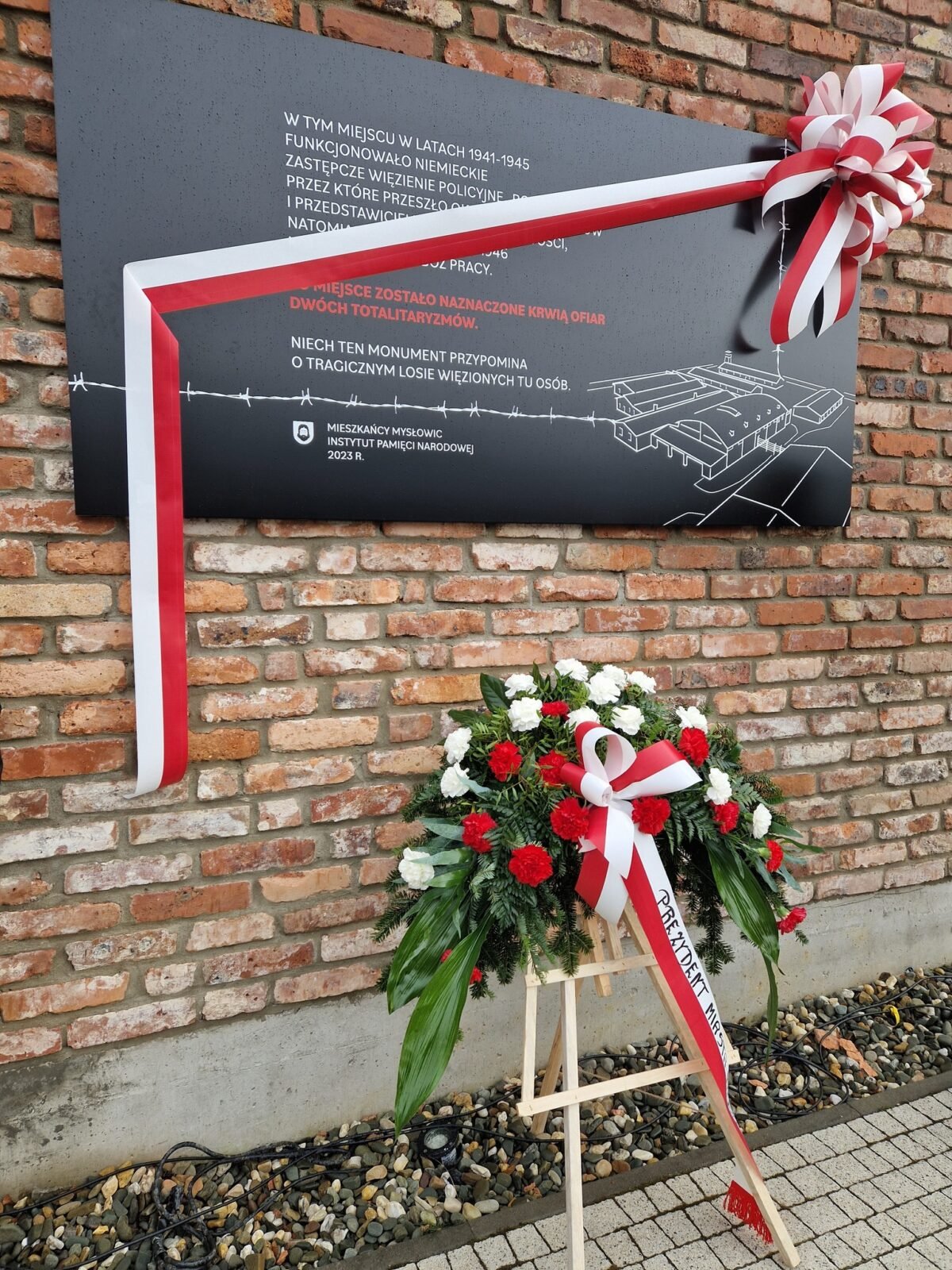 Tablicę umieszczono na murze imitującym fragment obiektu, w którym w latach 1941-1945 znajdowało się niemieckie zastępcze więzienie policyjne, przez które przeszło ok. 20 tysięcy Polaków i przedstawicieli innych narodowości, natomiast w latach 1945-1946 funkcjonował komunistyczny obóz pracy. Fundatorem tablicy jest Instytut Pamięci Narodowej. Organizatorem umieszczenia są Dariusz Wójtowicz – Prezydent Miasta Mysłowice, Muzeum Miasta Mysłowice, a także Wydział Kultury, Sportu i Turystyki Urzędu Miasta Mysłowice. Uroczystość uświetnili obecnością m.in.: Dariusz Ptaś – przedstawiciel marszałka województwa śląskiego Jakuba Chełstowskiego, dr Andrzej Sznajder – Dyrektor IPN Oddział Katowice, Jan Kwaśniewicz – naczelnik Wydziału Walk i Męczeństwa IPN, Dariusz Wójtowicz – Prezydent Miasta Mysłowice oraz przedstawiciele licznych organizacji, stowarzyszeń, szkół oraz mieszkańcy Mysłowic. Po okolicznościowych przemówieniach przybliżających historię tego miejsca nastąpiło złożenie kwiatów pod tablicą.