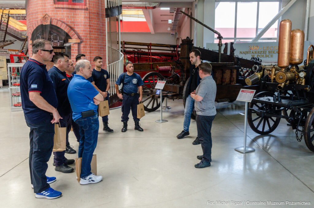 5 czerwca 2025 roku Centralne Muzeum Pożarnictwa gościło delegację strażaków z Argentyny.   Strażacy z Buenos Aires przybyli do Polski wymienić się doświadczeniami, szkolić się oraz poznać specyfikę polskiego pożarnictwa. Podczas tej wizyty, nie mogło zabraknąć poznania historii ochrony przeciwpożarowej na ziemiach polskich.  Delegację przyjęli pracownicy CMP: Grzegorz Mazur, Paweł Karol Gąsiorczyk oraz Michał Figzał.
