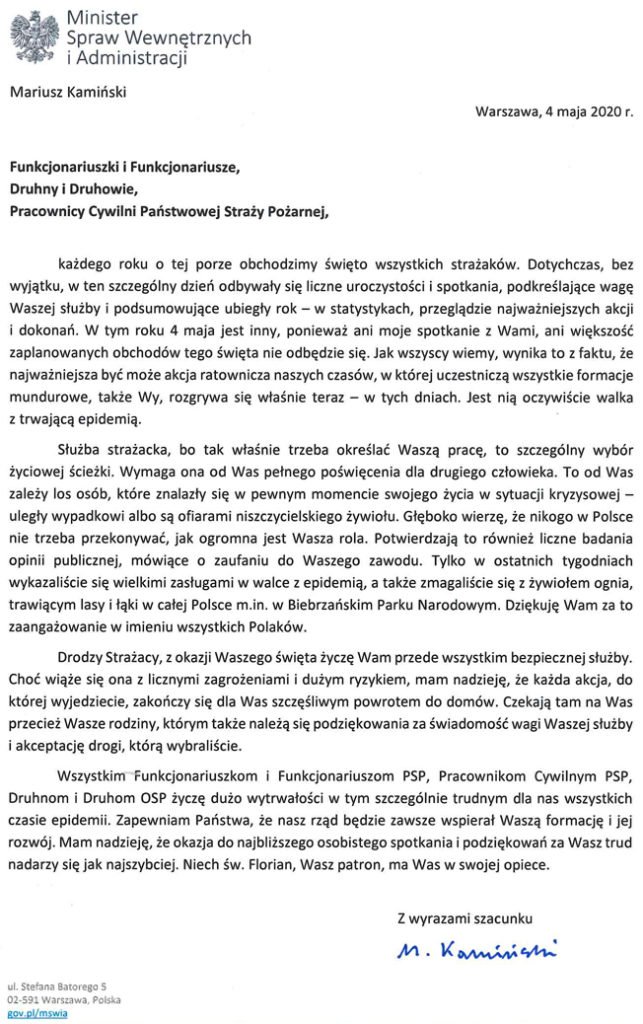 Życzenia Ministra Spraw Wewnętrznych i Administracji z okazji Dnia Strażaka