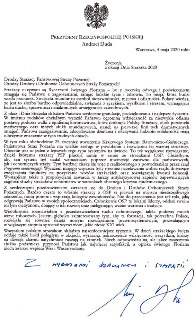 Życzenia Prezydenta Rzeczypospolitej Polskiej z okazji Dnia Strażaka